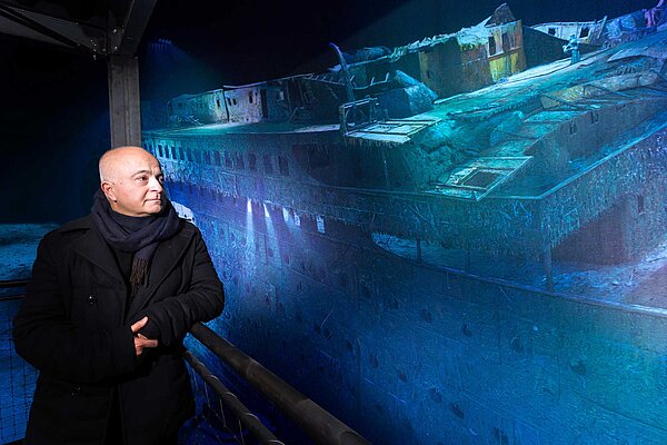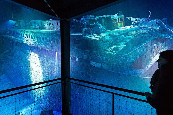Wie von 3.800 Metern unter dem Meeresspiegel betrachten die Besucher das Schiffswrack auf Augenhöhe. Durch ein künstliches Lichtszenario (wie bei einer großangelegten Expedition) wird das tragische Ausmaß des Unglücks erkennbar. Das Wrack ist in zwei Teile zerbrochen und ringsherum liegen zerstreut Alltagsgegenstände, technisches Equipment und Gepäckstücke, die das Schicksal der Passagiere und der Besatzung ins Bewusstsein bringen.
