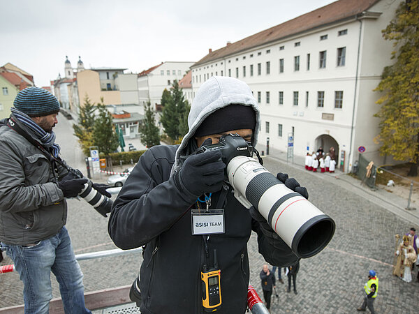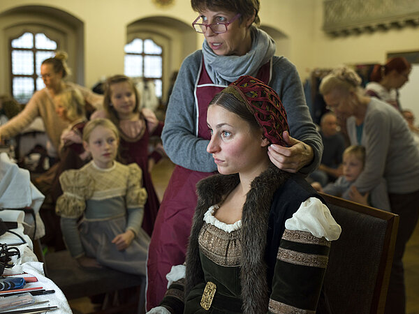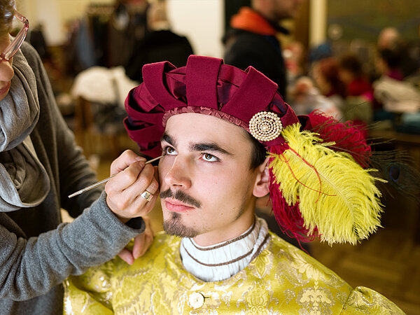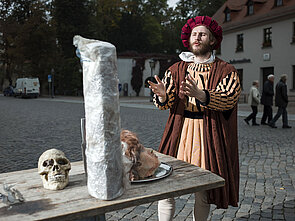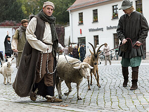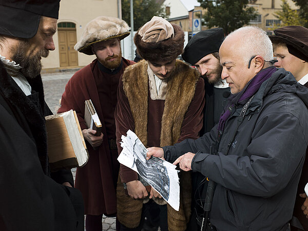 Um die passenden Komparsen zu finden, arbeiteten wir mit zahlreichen historischen Vereinen und Darstellertruppen aus Wittenberg und Umgebung zusammen; in die Rolle des Luther schlüpfte der Berliner Schauspieler Matthias Peikert. Da alle Komparsen zugewiesene Rollen und zur Konfektionsgröße passende Gewänder bekommen sollten, wurden in der Folge Kostüme, Requisiten, Echthaarperücken oder -bärte sorgfältiger denn je ausgewählt und nach Wittenberg gebracht.