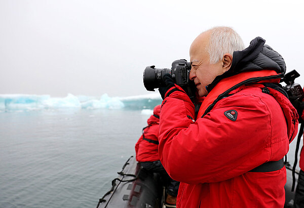 Heute Morgen steht er lange vor uns anderen am Oberdeck. Mitten im eisigen Polarwind. Er hat nicht viel geschlafen, aber das sieht man ihm nicht an. Er strahlt. Er saugt die Natur mit allen Sinnen auf. Als einziger von uns hat er miterlebt, wie der Nebel sich langsam verzog, wie aus der dichten Suppe des Südatlantiks plötzlich weiße Berge auftauchten.