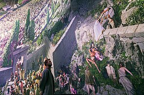 PERGAMON - die glanzvolle hellenistische Metropole, die wie kaum eine andere die Errungenschaften ihrer Zeit in Architektur, Kunst und Kultur in sich vereinte: In einer einzigartigen Kooperation von Kunst und Wissenschaft wurde Pergamon mit seinen Bewohnern in einer Ausstellung mit 360°-Panorama so lebensecht inszeniert und erlebbar gemacht, als stünde man selbst im Jahr 129 n.Chr. im Zentrum der antiken Stadt und ließe seinen Blick über die Szenerie rund um die Akropolis schweifen.